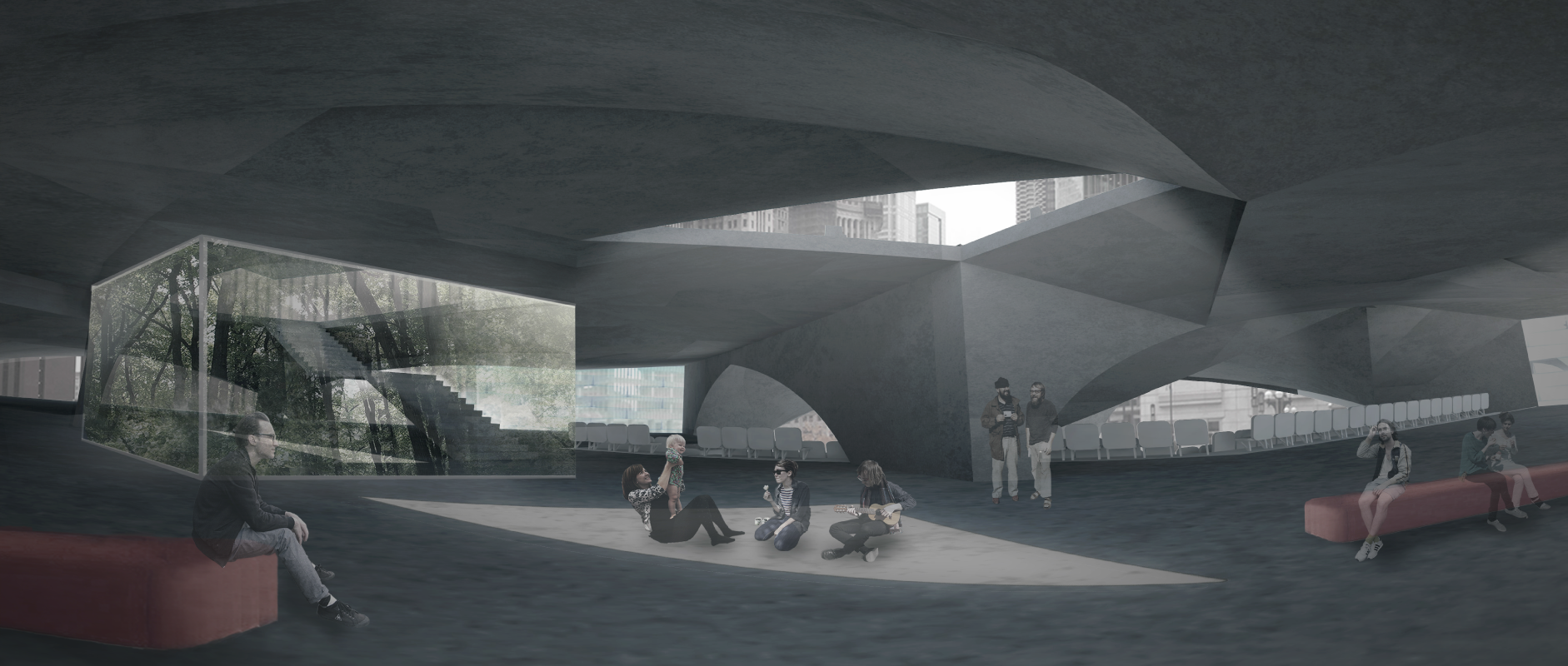 The site is located alongside the Chicago river within the north-loop, right in between a river esplanade and a busy commercial area. Most people that enter the site have a tendency to move diagonally across it to get to offices on the north end. Because of the unique nature of our program (greenhouse/vivarium), we approached the site with the idea that the building could act as a buffer zone and slowly transition pedestrians from a more relaxed riverfront into the more urbanized area.