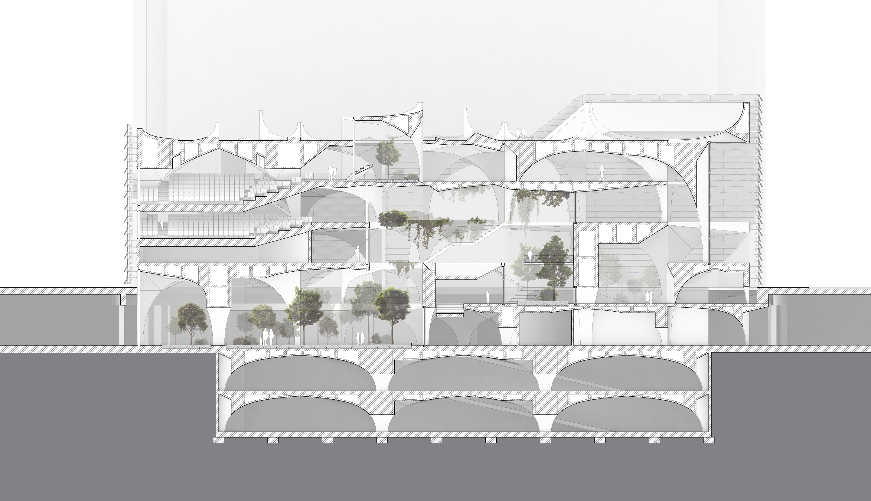 The module is stretched and compressed to produce a range of modular primitives that vary in size and volume. These units are then paired among themselves to form multiple clusters, platforms and towers that address both the need for geometric variation and programmatic requirements. The result of this modular aggregation is a massing that consists of volumes from 10’ pocket spaces to major load-bearing arches that measure 45’ in height and spans over 30’.