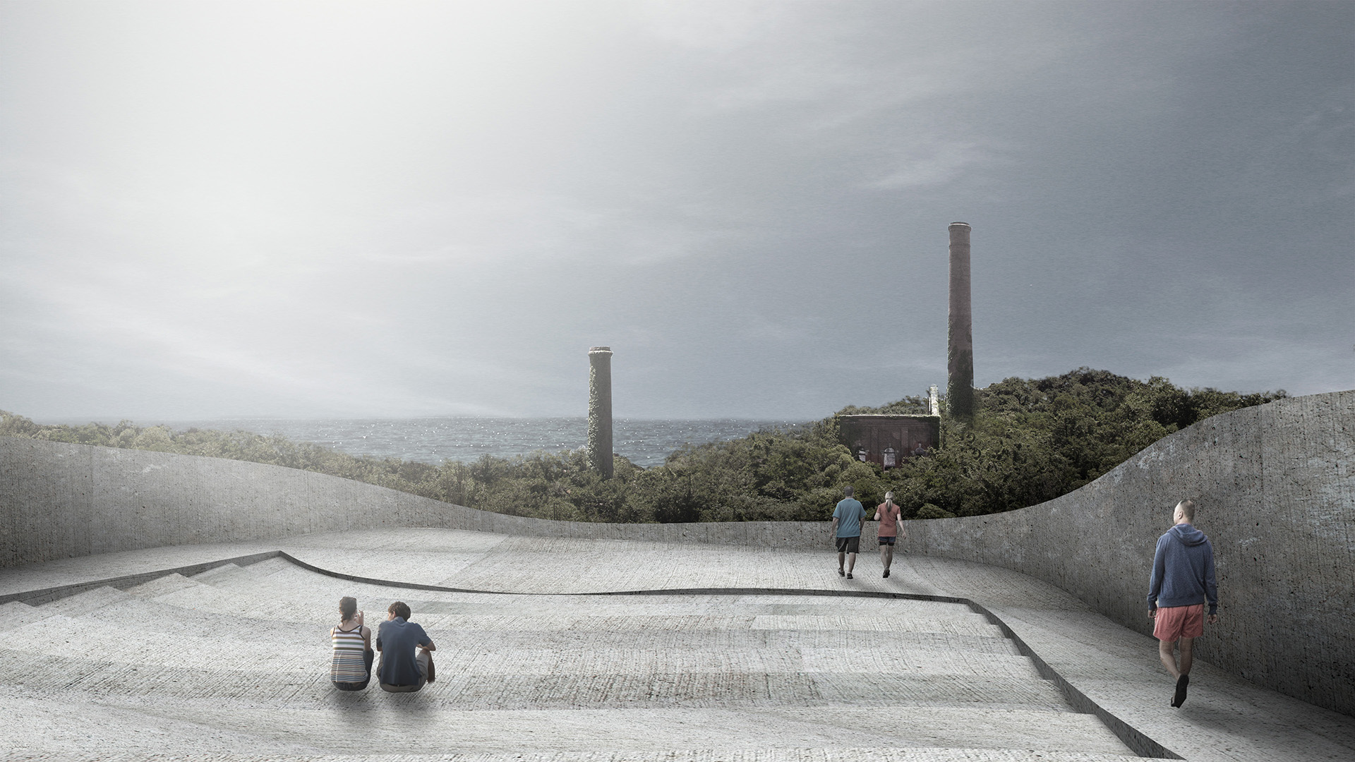 This proposal is situated on the east side of the Inujima island, close to Hiroshi Sambuichi's remodeled Seirensho museum. On this part of Inujima lies an interesting phenomenon where chimneys ruins present a discrepancy to not only the island, but the region’s subtle, undulating topography. The verticality of the chimneys poses a tension among them in both their varying heights and spread on the island.