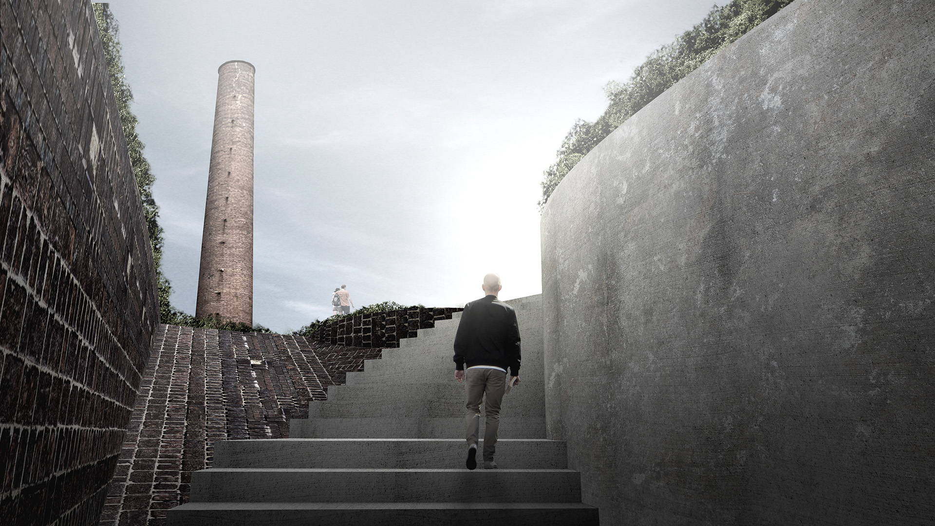 The area consists of a total of six chimneys, three larger and three smaller ones. Most of them were left untouched since they were abandoned, except a single one attached to the Seirensho museum, which is used for ventilation. This project is interested in a new way of experiencing this network of chimneys and at the same time allow for performances to be held. A neighboring pair of large/small chimneys were selected as anchor points for a path that points to various chimneys within the network. This meandering path tapers and expands at various viewpoints to create thresholds for event and meditation spaces.