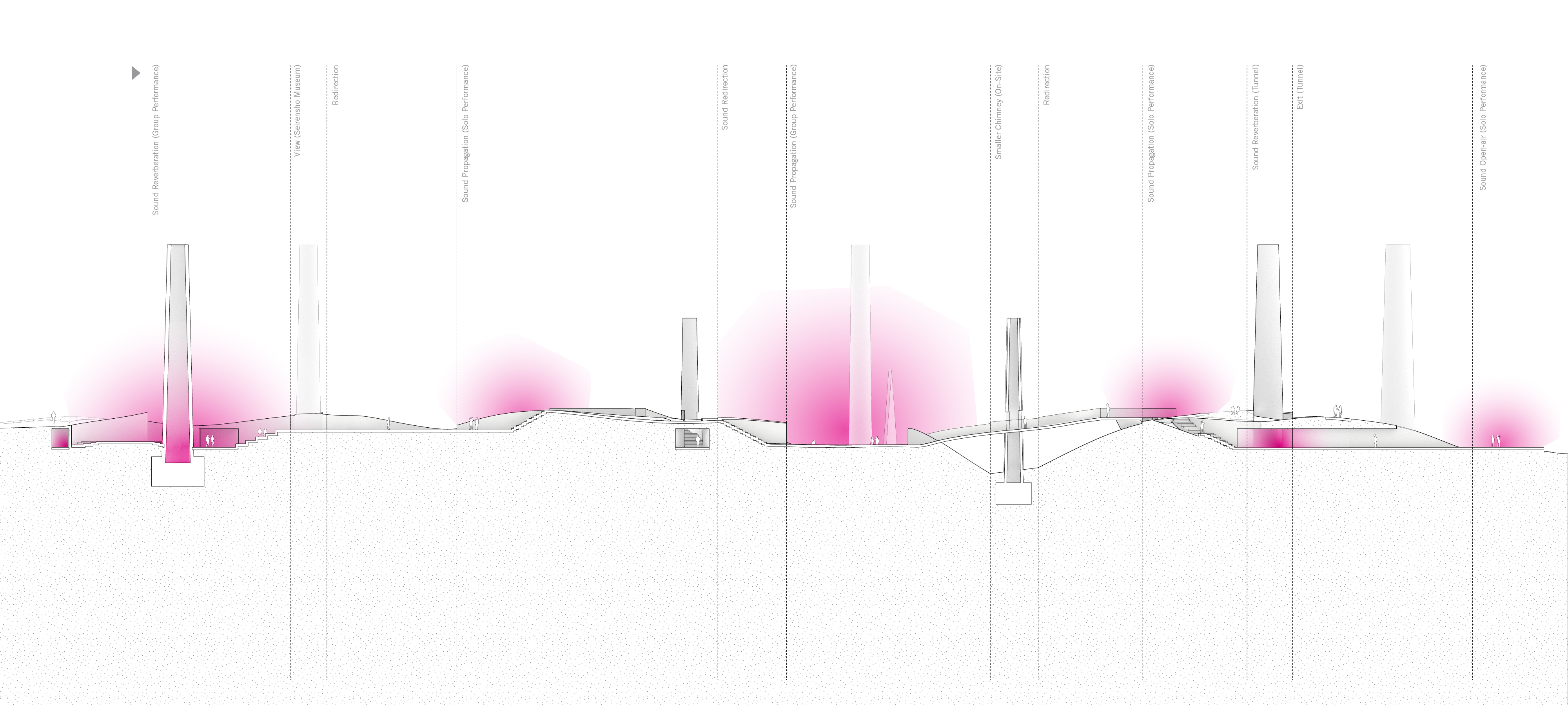 During an event, one is first greeted by a solo performer at the entry space. One then proceeds toward the point of bifurcation where sound is reverberated through the tunnel connected, guiding one towards the first event space where large scale events take place. One then continues up and is immediately drawn by sounds coming from the open-air group performance space on the other side. The path goes on to travel through the chimney and again brings one to another solo performance space, ending the journey.